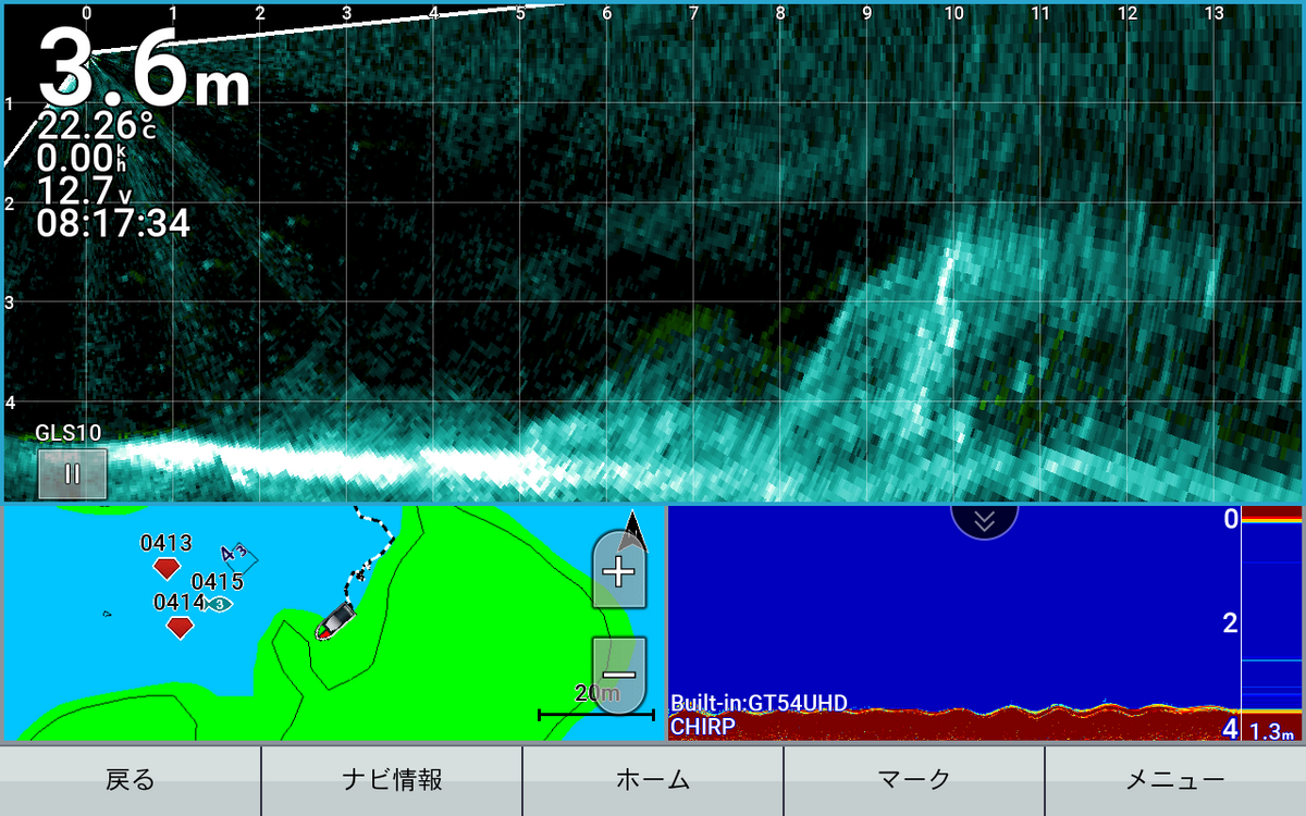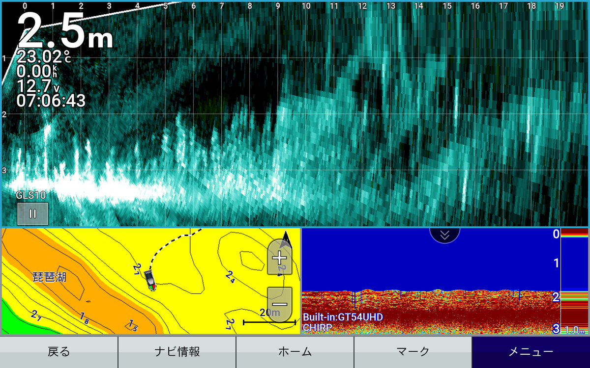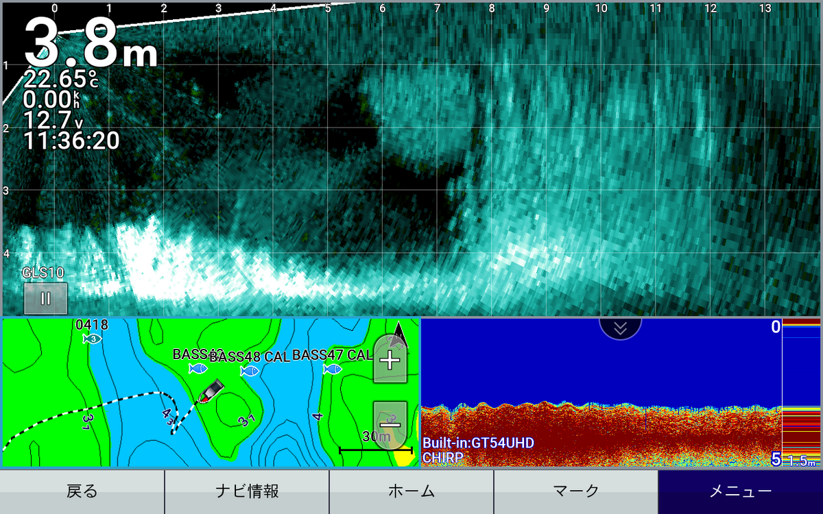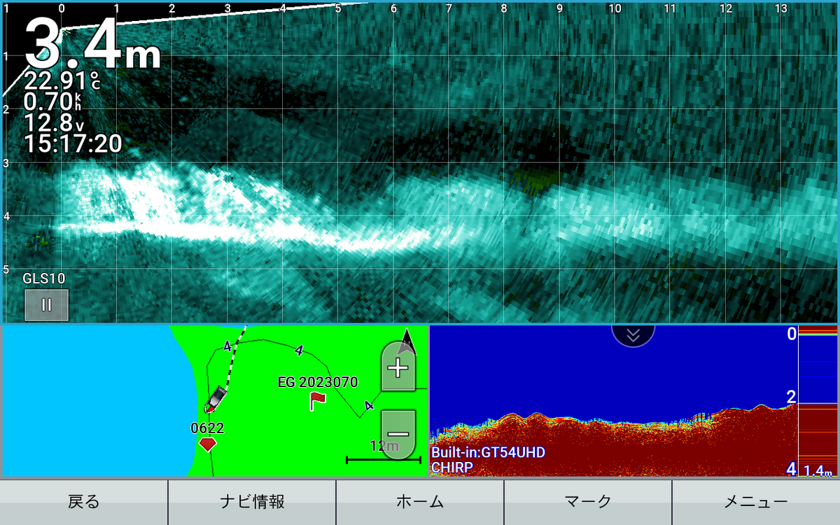 スイベルキャロの釣り方はエレキで流す場合や風に乗って下物浚渫のハンプやウィード(エビ藻とカナダ藻)の上を流すので、ガーミンのパースペクティブモードも良いが、エレキ・ゴーストの方が有効利用できると考えました。